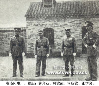 在洛阳电厂。右起:蒋介石、冯钦哉、何应钦、张学良