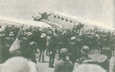 西安各界群众在飞机场欢送杨虎城。上飞机舷梯者为杨虎城。